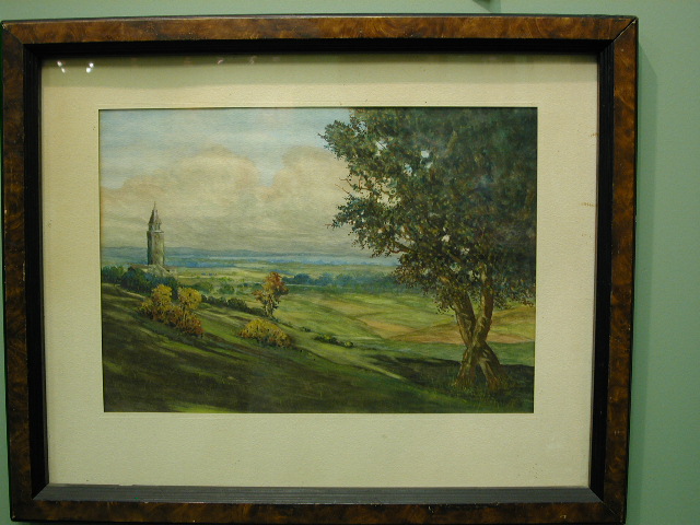 This finely done watercolor is signed K. Kratz lower left. I assume it is by a european artist as the scene depicts a landscape with european looking structures. It is framed in a two tone wood veneer frame which suites it nicely. Price $495.00